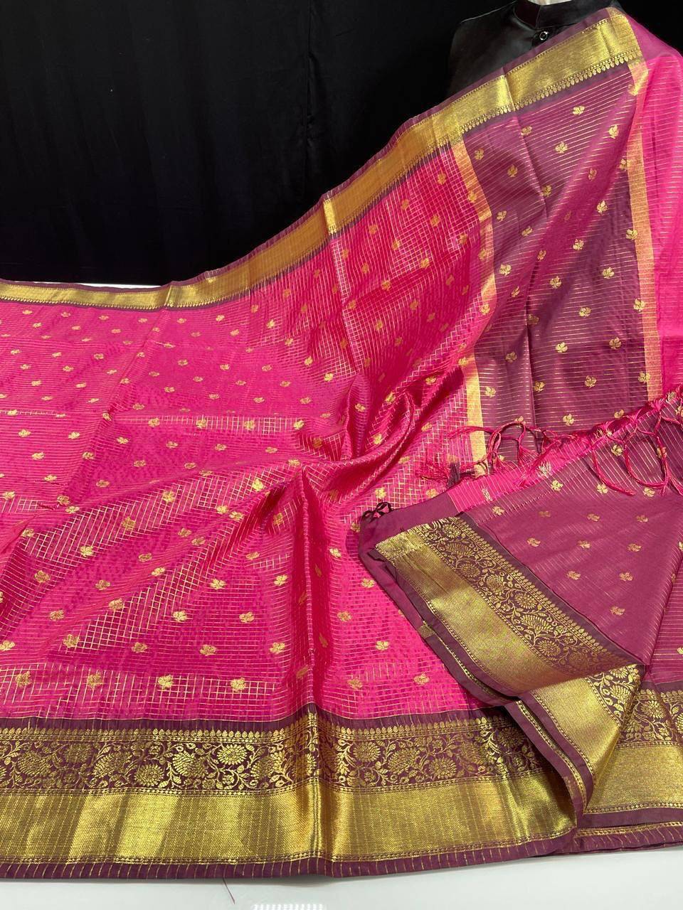 Checks Design Semi Kanchi Sarees Pink