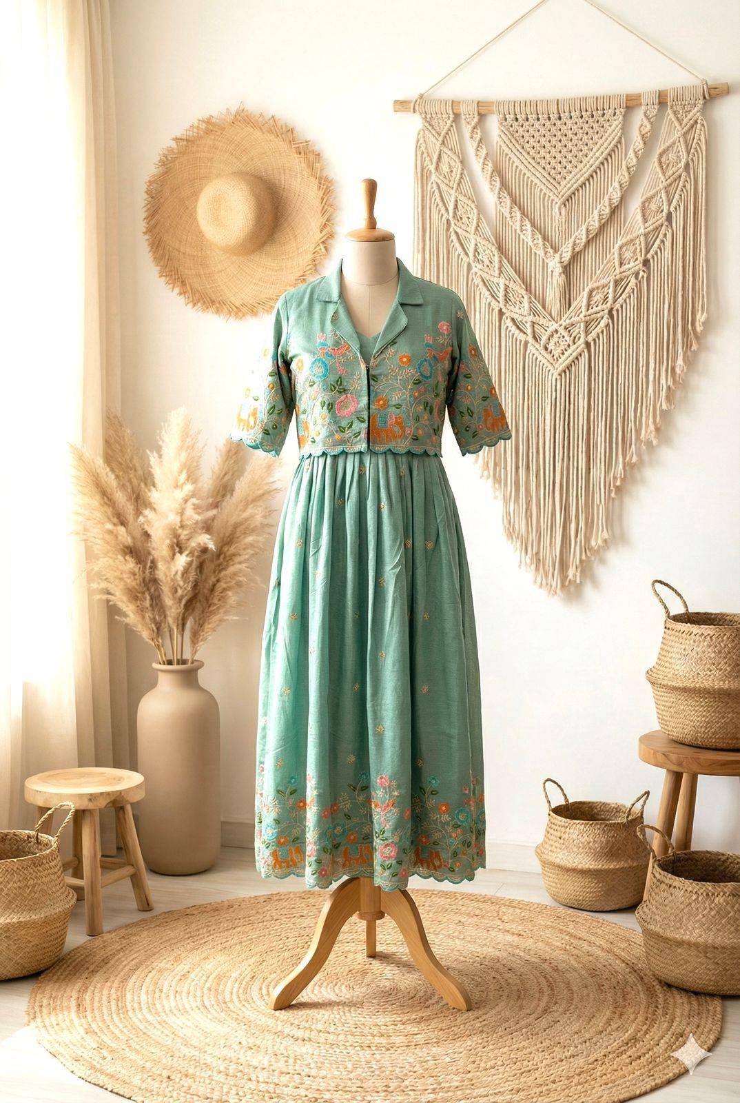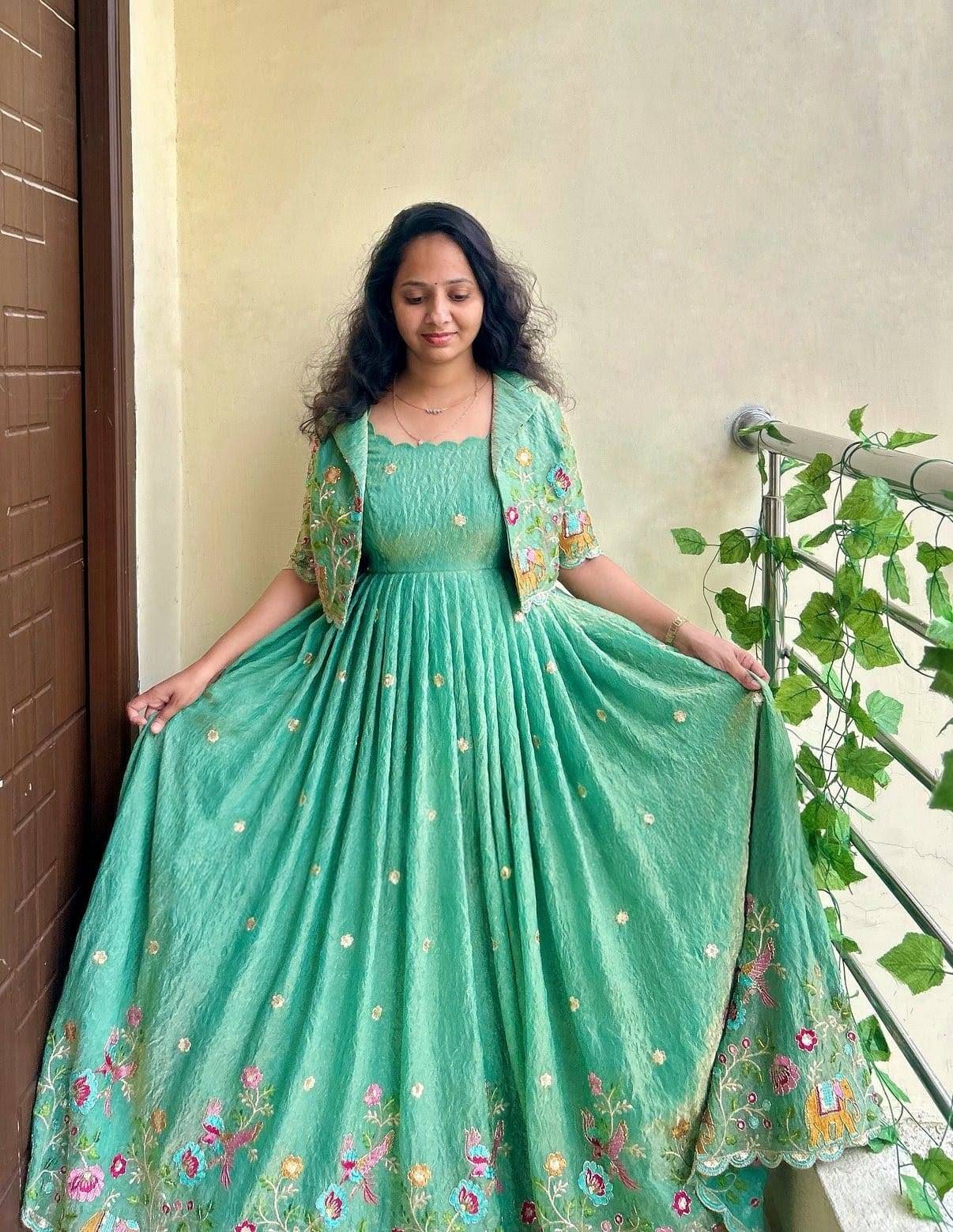 Stay Effortlessly Beautiful In Our Embroidery Gown And Jacket A Perfectly Enhanced With Colourful Work All Over Gown and Jacket The Outfit Comes Paired With A Gown and Short shrug Style it in your Own way ✨