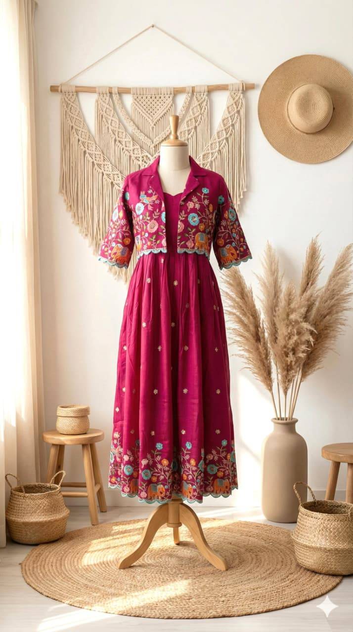Stay Effortlessly Beautiful In Our Embroidery Gown And Jacket A Perfectly Enhanced With Colourful Work All Over Gown and Jacket The Outfit Comes Paired With A Gown and Short shrug Style it in your Own way ✨