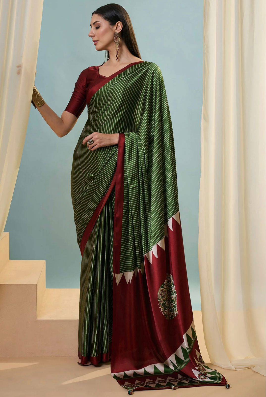 - Design: Featuring a beautiful digital print that showcases stunning patterns, harmoniously blending green and maroon hues. The intricate designs are sure to make you stand out, as reflected in the captivating visuals of the saree.