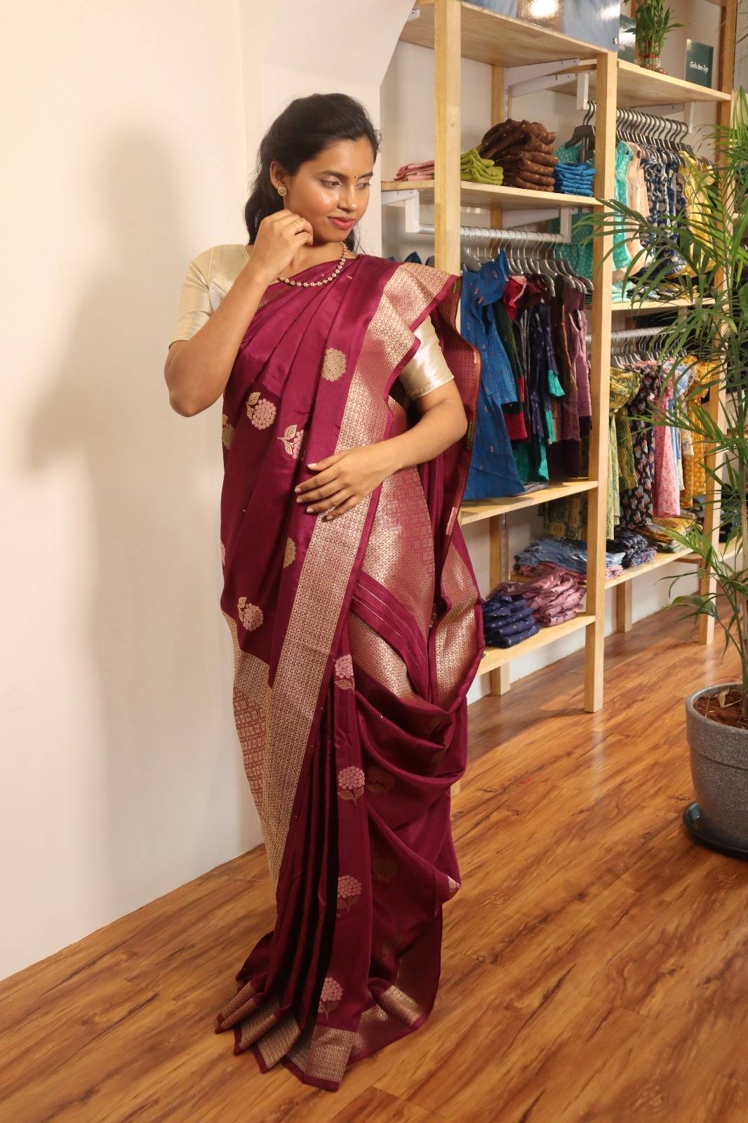 Discover the charm of traditional Indian attire with our Maroon Muga Silk Saree and redefine your style today!