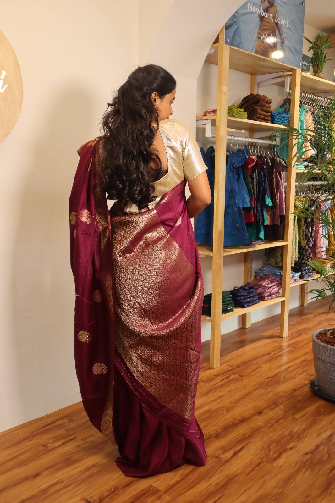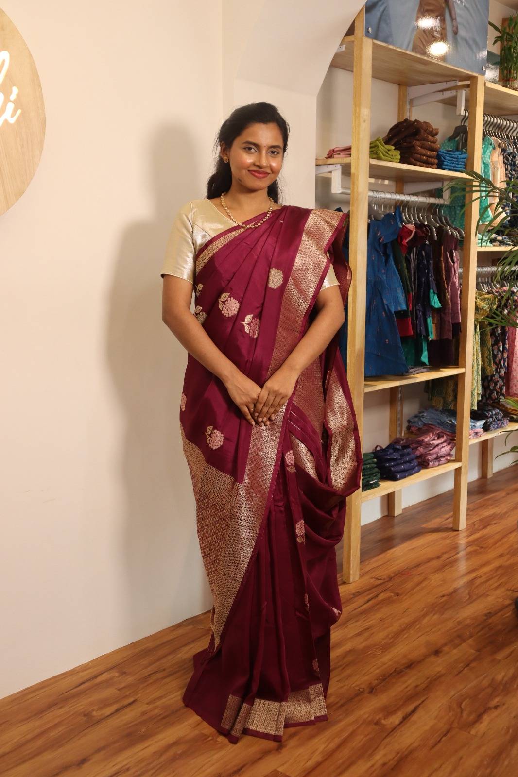 The intricate patterns woven into the saree exude sophistication, making it perfect for festive occasions and elegant gatherings. The rich maroon hue, complemented by subtle gold motifs, adds a touch of regality to your ensemble.
