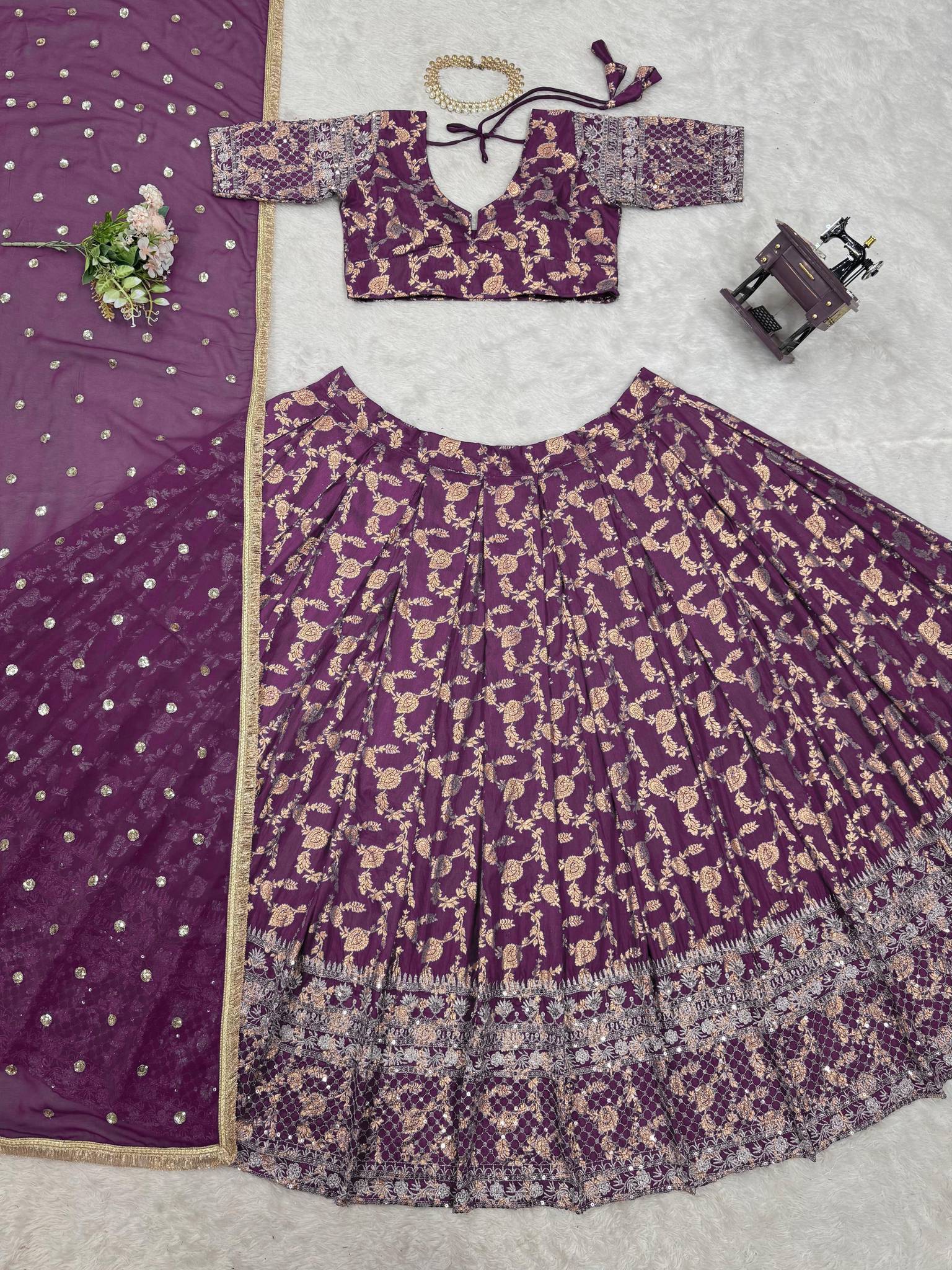Fabric. : Jequrd Work. : thread with Sequnce Size : Up to 44 Inner. : Micro Lehengha Type : Semi-Stitch with cancan with canvas pata❤️🔥❤️🔥